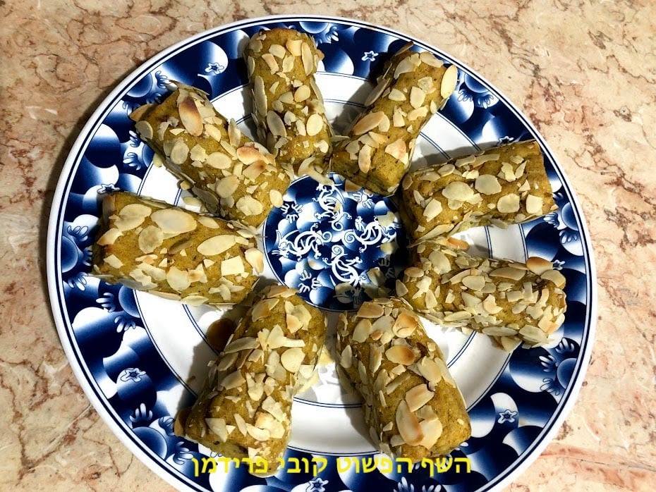קרוקטים מפירה תפו״א עם בצל מקורמל בציפוי שקדים פרוסים טבעוני ללא גלוטן,לקחת 1 ק״ג תפו״א לבשל עם חצי כפית מלח הימלייה עד רכות לסנן וליבש,להכין פירה דקדק,להוסיף כף אבקת התיבולית ראס אל השף הפשוט(תחליף ביתי לאבקת מרק משודרגת טבעית ללא חומרים מוספים)חצי כוס טחינה גולמית חצי כפית פלפל שחור גרוס חצי כפית מלח הימלייה 3 בצלים מקורמלים כוס וחצי קמח חומוס לערבב לתערובת אחידה לקרר,לחלק ל 3 חלקים שווים,לרדד כל חלק לגליל באורך 36 ס״מ בקוטר 3 ס״מ, לחתוך כל גליל ל6 חלקים שווים(6 ס״מ אורך),לגלגל כל קרוקט(גליל)בצלחת עם שקדים פרוסים(להדביק מסביב),להניח על נייר אפייה בתבנית אפייה,לרסס מעט שמן,להכניס לתנור חם על 180 מעלות לאפות עד הזהבה יפה של השקדים ובתאבון.