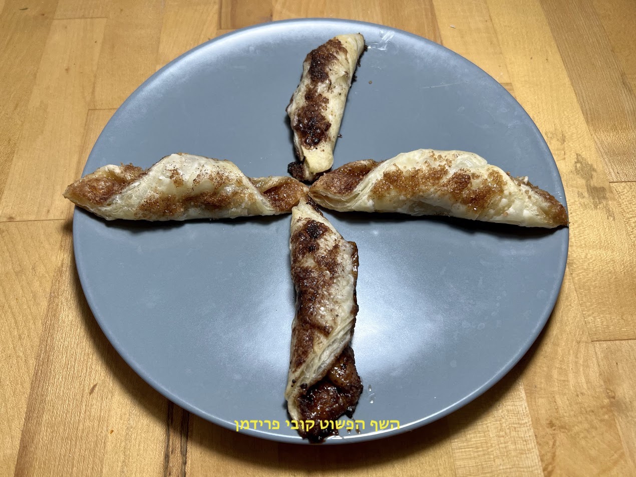 לחתוך עם סכין פיצה ל4 משולשים לגלגל לרוגלמלווח מבחוץ פנימה,
