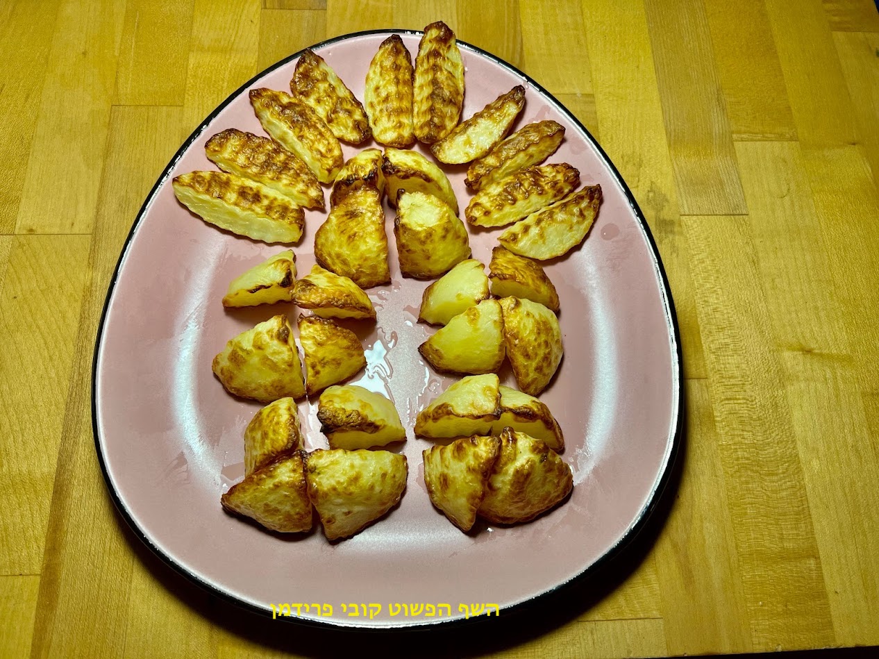 לקחת כמה תפו״א גדולים מקולפים לחתוך לחצי להעמיד את החצי לחתוך עם סכין זיגזג ל4 משולשים,