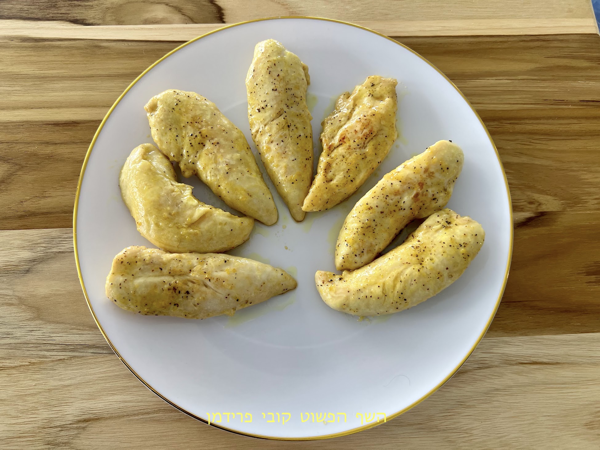 לקחת חצי ק״ג פילה עוף(7 חתיחות)לפזר מעל פלפל שחור לימון גרוס(תבלין),