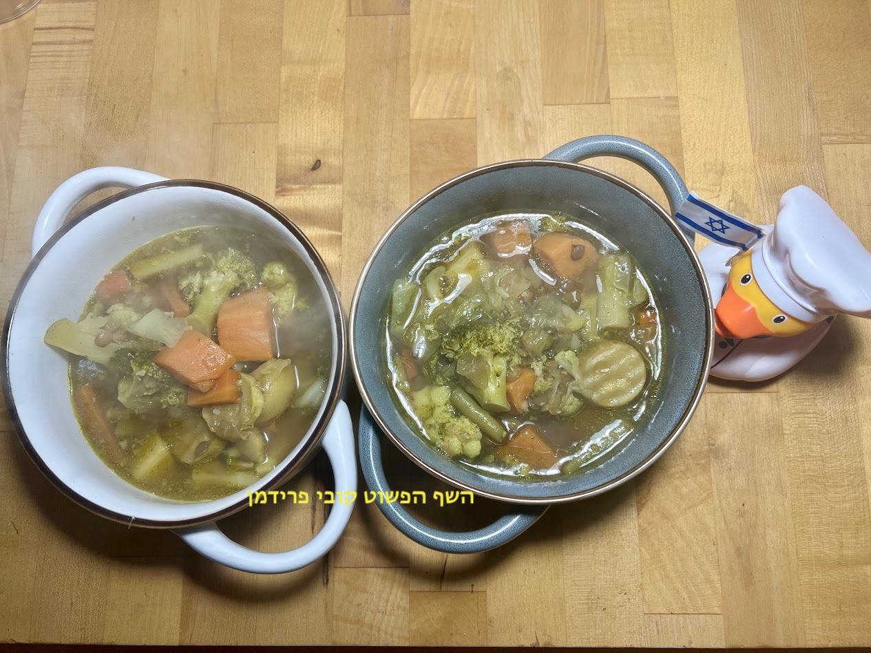 להוסיף 2 גזרים בטבעות דקות ו 2 גזרים במקלונים דקים חצי על חצי ס״מ באורך 2 ס״מ 4 תפו״א בינוניים בקוביות של 1 וחצי ס״מ,
