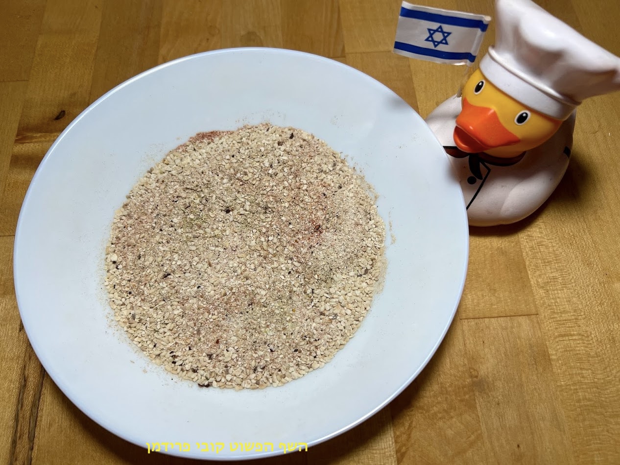 להכניס לקערת ערבוב 3/4 כוס קמח מצה כפית מתיבוליות השף הפשוט-ראס אל השף הפשוט(תחליף ביתי לאבקת מרק משודרגת משורשים ועשבי תיבול טבעית ללא חומרים מוספים-יצור עצמי)כף פפריקה 3 כפות שומשום קלוי חצי כפית פלפל שחור גרוס חצי כפית מלח הימלאיה לערבב,