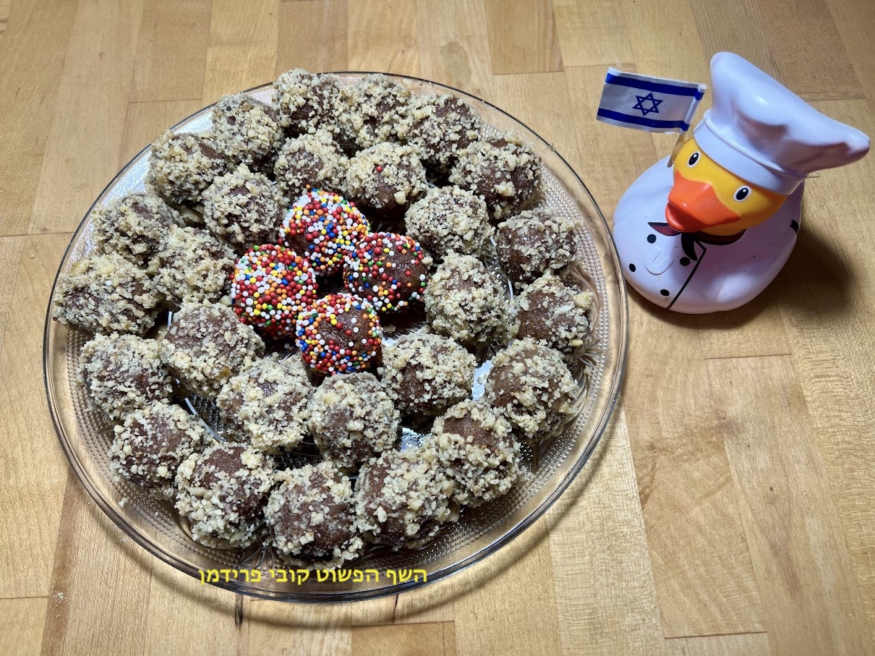 לגלגל את הכדורים בפירורים של אגוזי מלך ולילדים סוכריות צבעוניות ובתאבון.