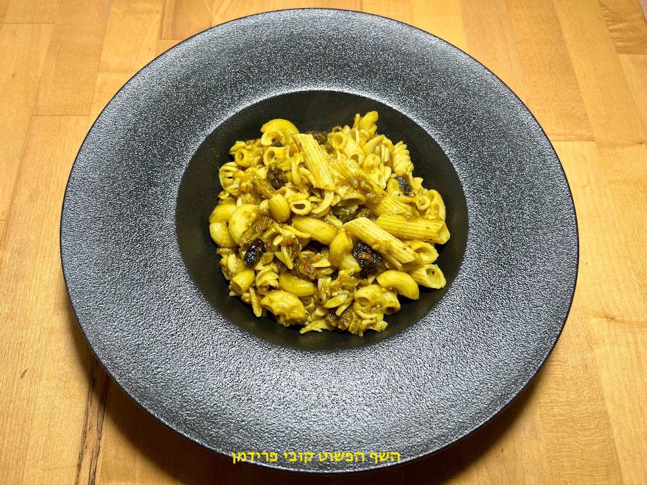 פסטה עם פירות יבשים פיצוחים ובצל מקורמל לראש השנה טבעוני: