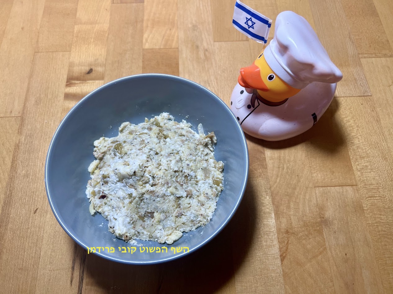 להוסיף 50 גרם גבינה פרמזן 50 גרם גבינת גאודה מגוררת 50 גרם גבינה צפתית 5% מגוררת 4 כפות טבעות זיתים קצוצות דק כף וחצי פסטו זעתר רבע כפית פלפל שחור גרוס,