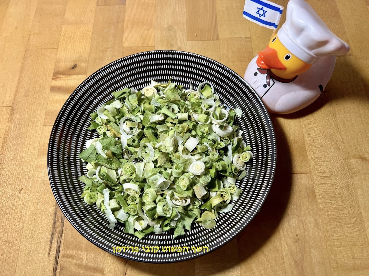 לחתוך לטבעות דקות את הגבעולים ואת העלים הירוקים לחתיכות של 1-2 ס״מ,