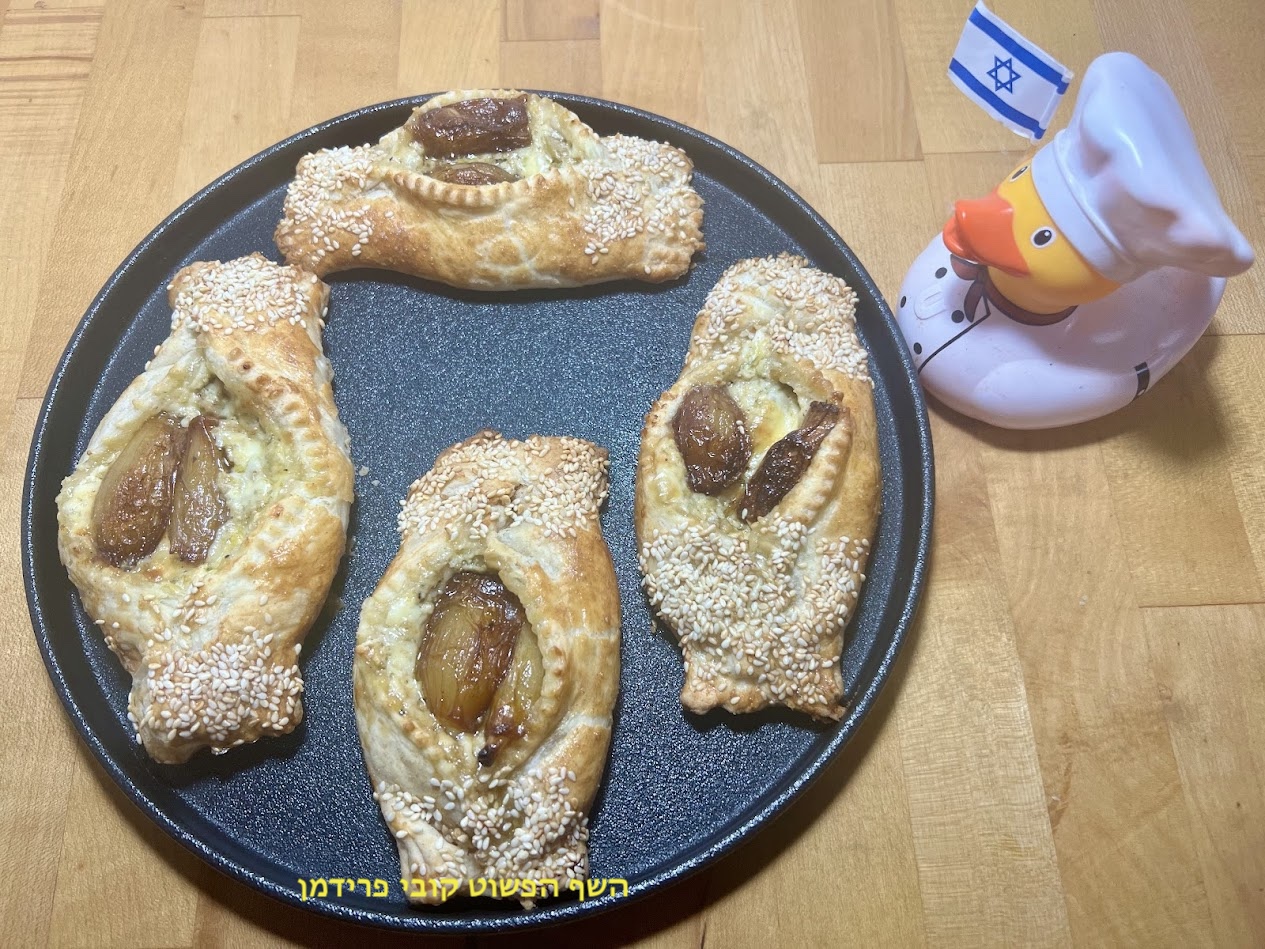 מאפה בצק עלים(חצ׳פורי)לשבועות במילוי תערובת גבינות ובצלצלים מקורמלים: