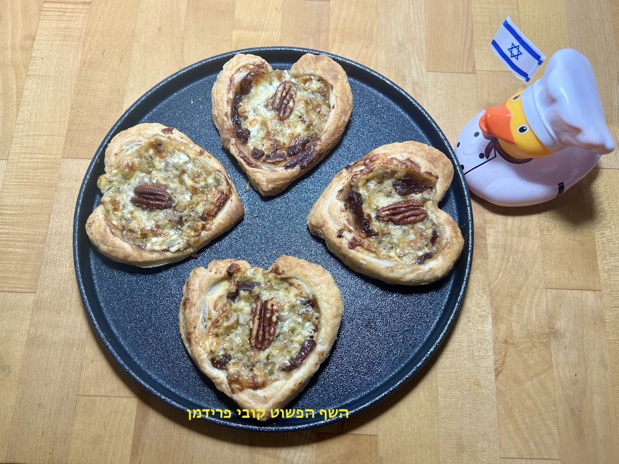 מיני טארט(לב) אישי לשבועות במילוי ריבת בצל ותערובת גבינות זיתים בניחוח זעתר(פסטו)עם פקאן: