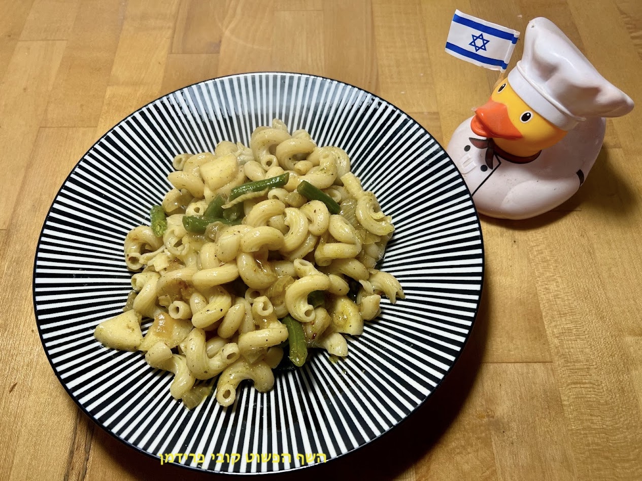 פסטה צלנטני(צינור לוליאן) עם לבבות דקל שעועית ירוקה ובצל מקורמל טבעוני: