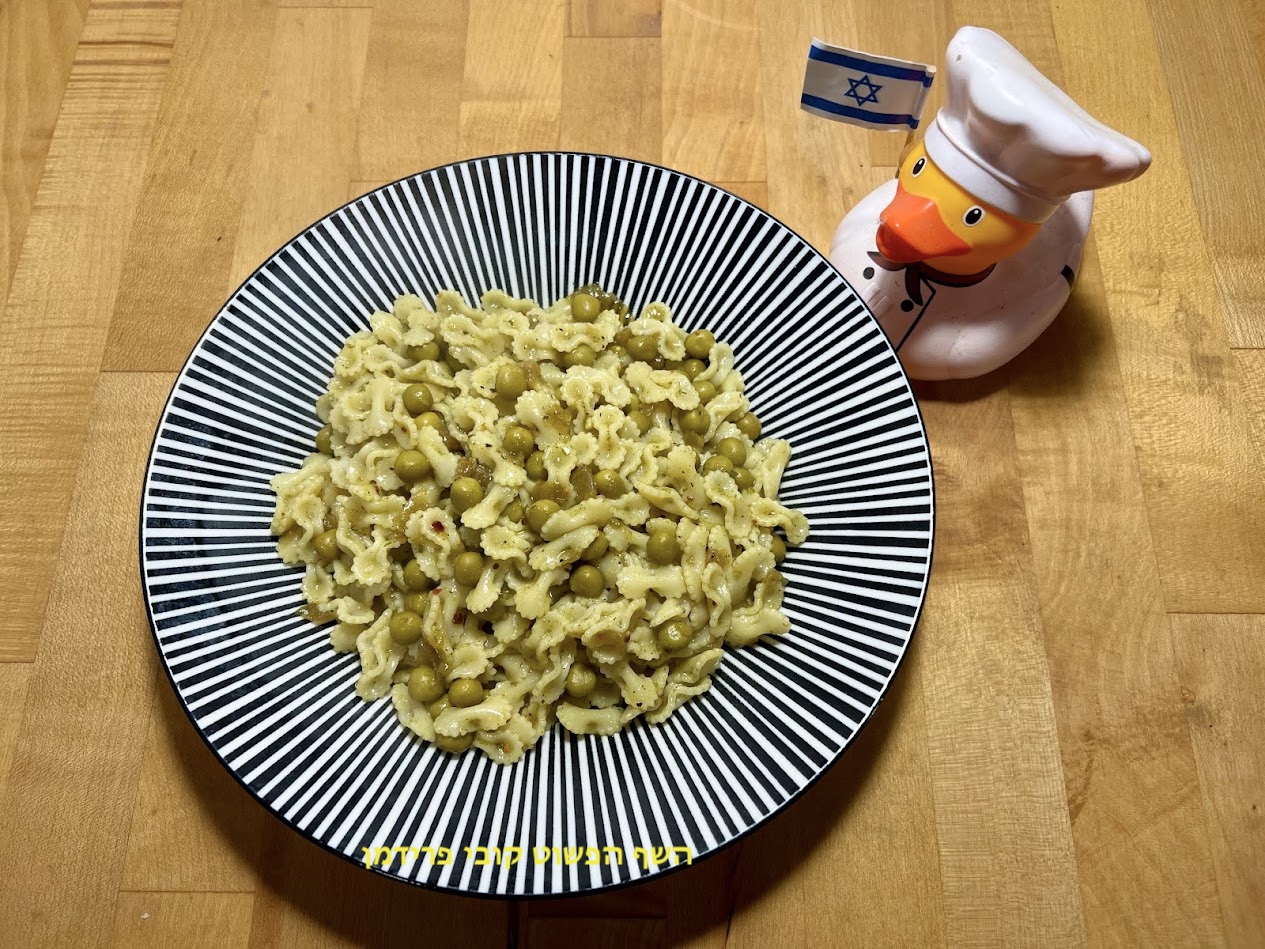 פסטה מיני פארפלה(מיני עניבות farflline)עם אפונה ובצל מטוגן טבעוני: