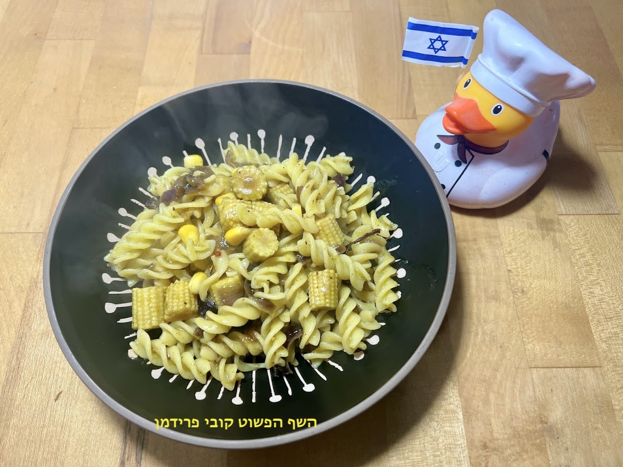 פסטה פוסילי(ביסלי)עם תירס גמדי גרגירי תירס ובצל סגול מקורמל טבעוני ללא גלוטן: