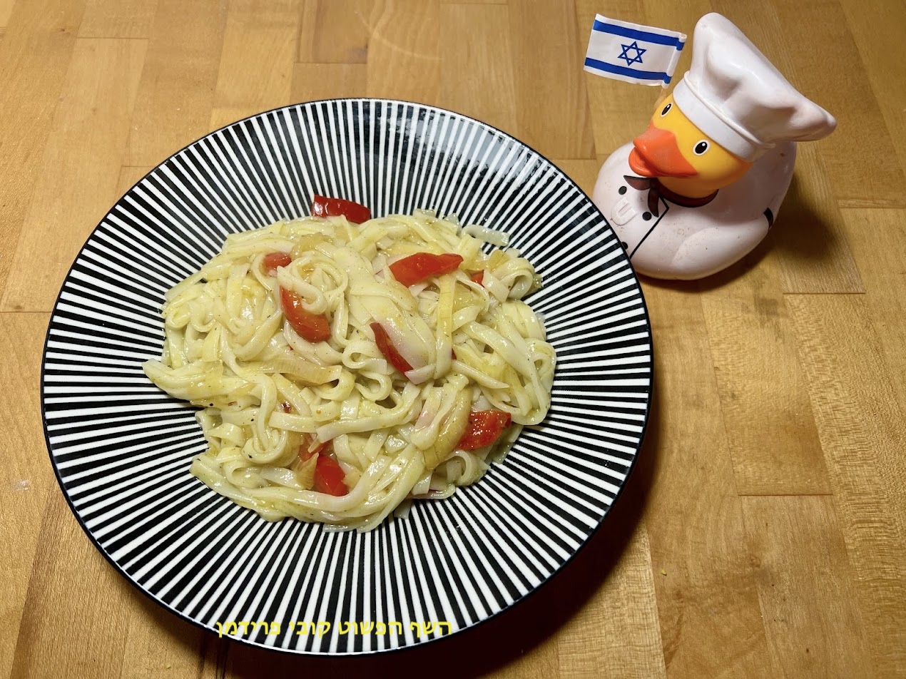 אטריות אורז רחבות עם פלפל אדום ובצל זהוב טבעוני ללא גלוטן: