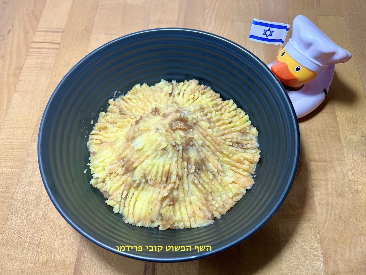 מועכים לפירה דקדק מוסיפים 4 בצלים מקורמלים וקופסת שעועית אפויה ברוטב עגבניות מעוכה לפירה,
