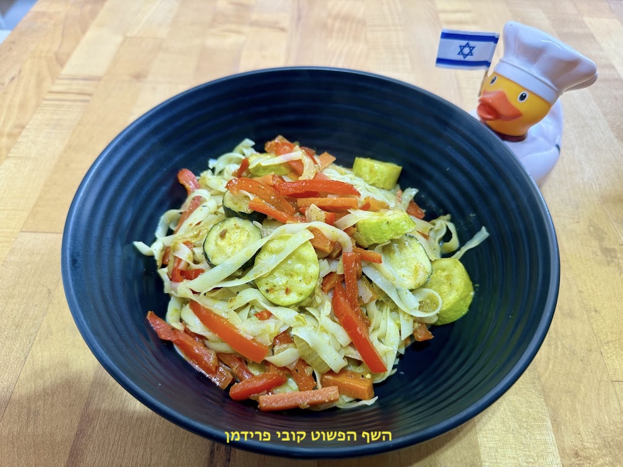 מוקפץ עם איטריות אורז בתוספת רצועות פלפל מקלוני גזר טבעות זוקיני וקישוא טבעוני ללא גלוטן: