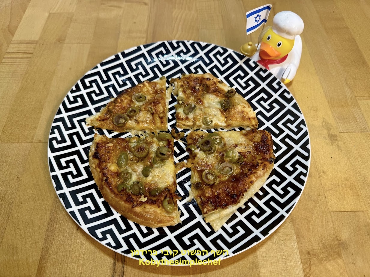 מלווחפיצה עם תערובת גבינות וזיתים מתובלת בתבלין פיצה ביתי אורגני: