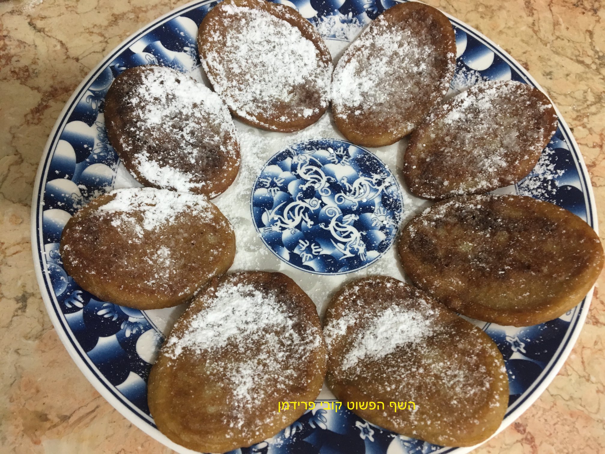 לפזר אבקת סוכר ובתאבון.(אפשר גרסה מלוחה עם כפית מלח הימלייה הגשה עם שמנת חמוצה בפסח שתי הגרסאות רק עם קמח מצה מתכון שעבר בבית הורי מדור לדור ממזרח אירופה ושידרוג שלי)(יוצאים 32 חרמזלך)