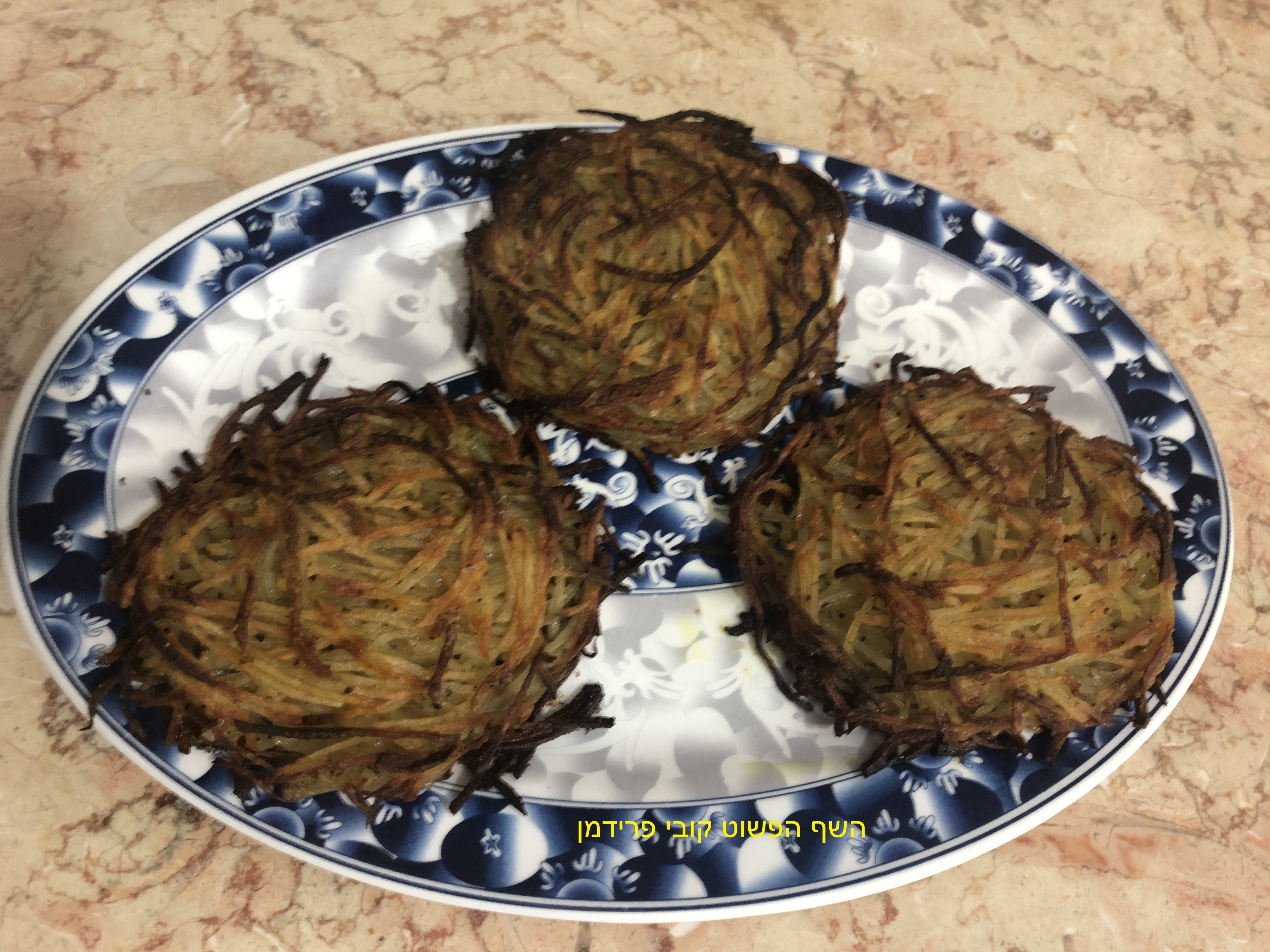 לקלף 1 ק"ג תפו"א לחתוך לג'וליאנים (אני חתכתי במעבד מזון אפשר עם קולפן ג'וליאנים ידני),
