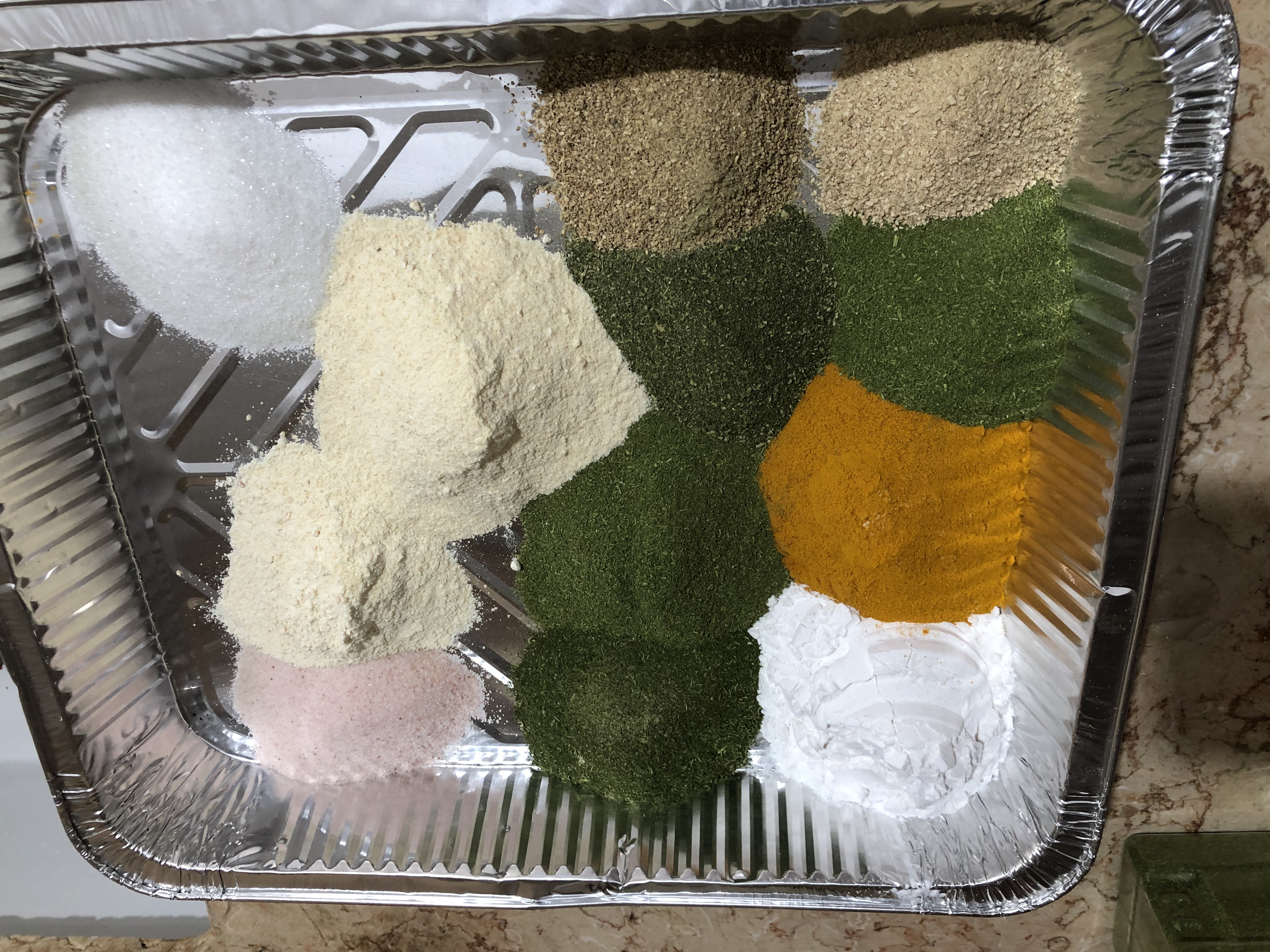 להוסיף 20 ג"ר אבקת פטרוזיליה 20 ג"ר אבקת שורש פטרוזיליה 30 ג"ר אבקת שמיר 20 ג"ר אבקת כוסברה 20 ג"ר אבקת עלי סלרי 20 ג"ר אבקת ראש סלרי 30 ג"ר אבקת שום 60 ג"ר אבקת בצל(יצור עצמי ביתי),