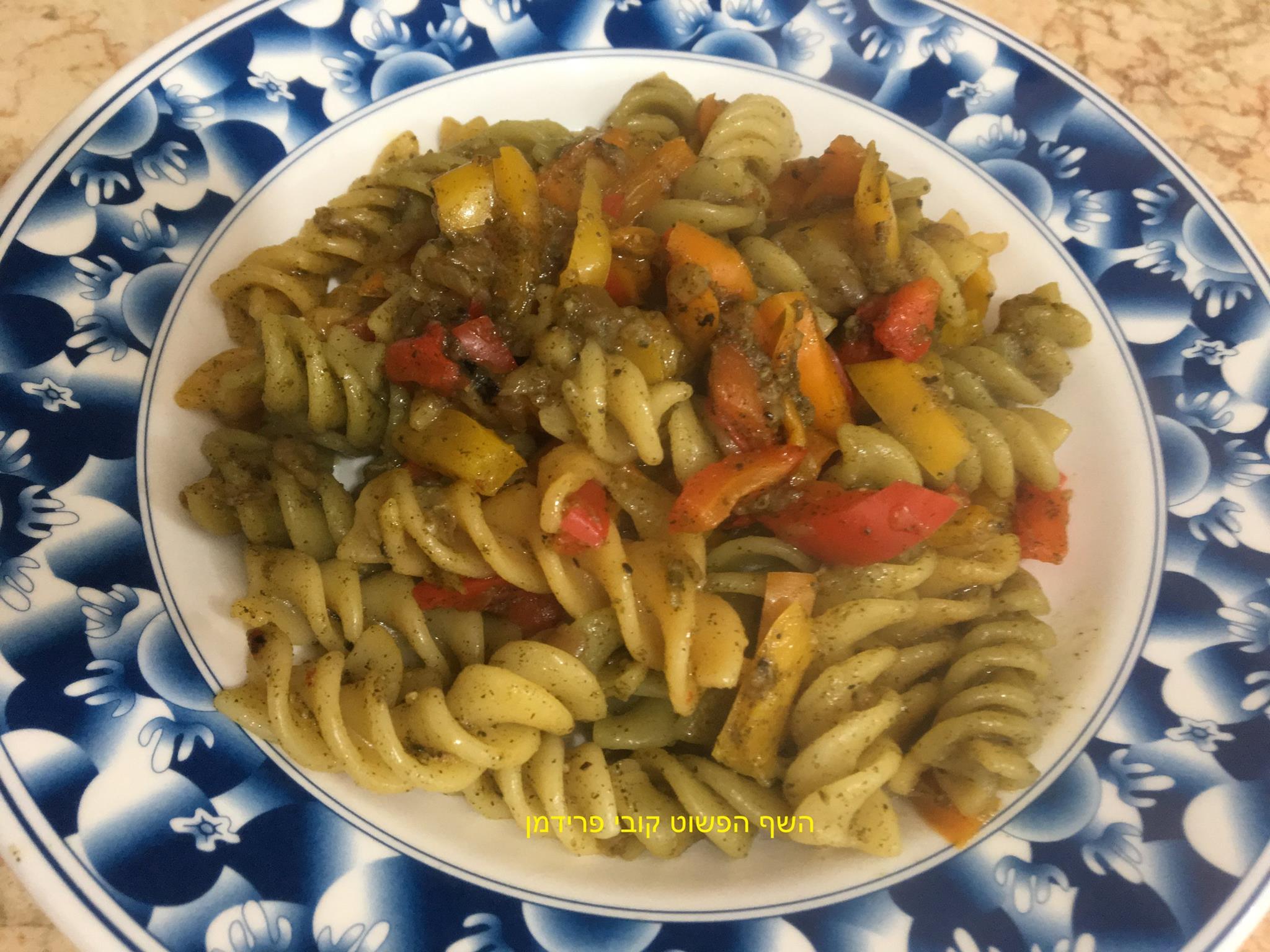 פסטה פוסילי (בסלי)בשלושה צבעים רגיל עגבניות תרד עם רצועות פלפלים בשלושה צבעים ובצל מקורמל,