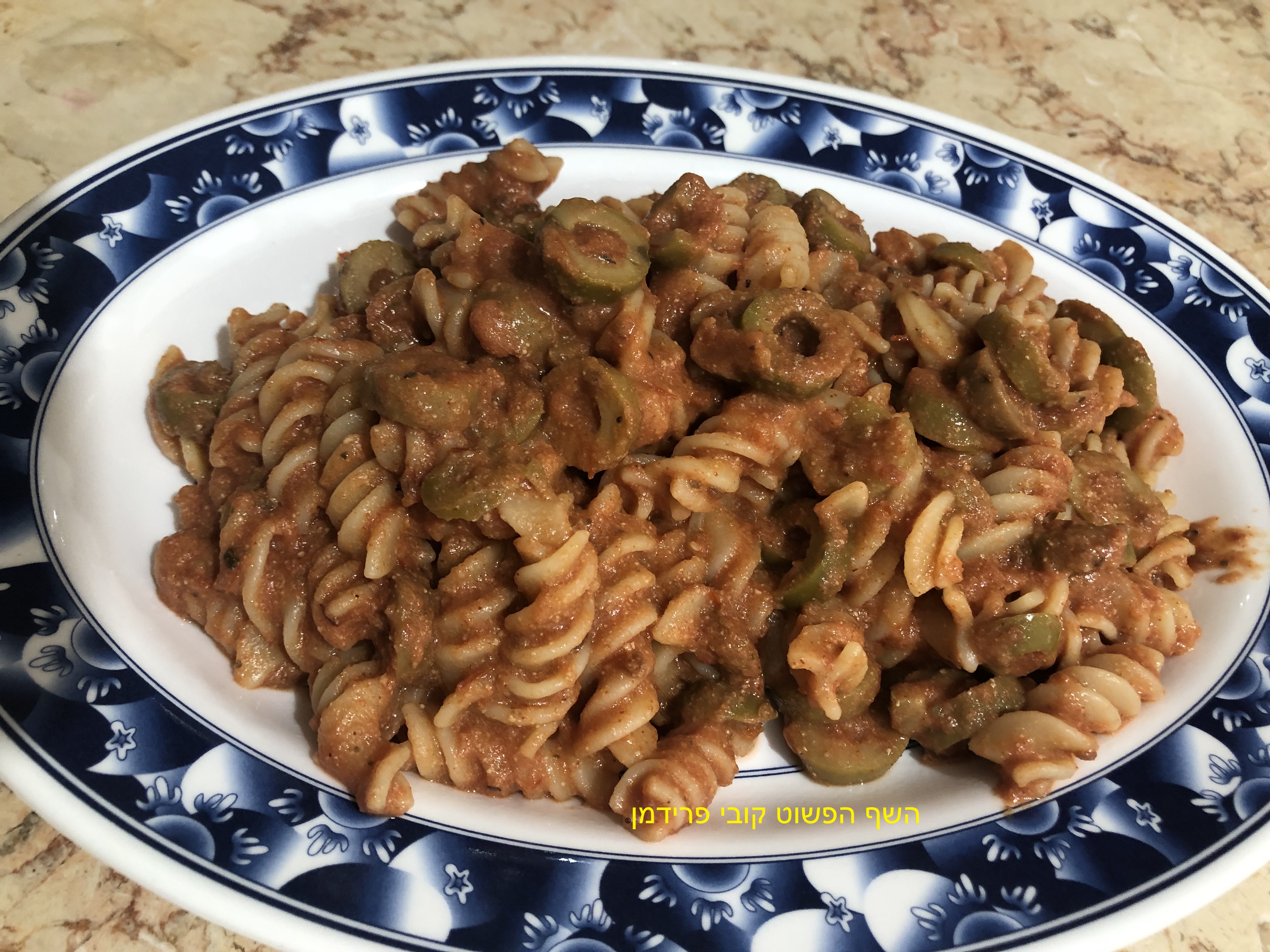 פסטה פוסילי(ביסלי)ברוטב עגבניות טחינה וזיתים טבעוני,