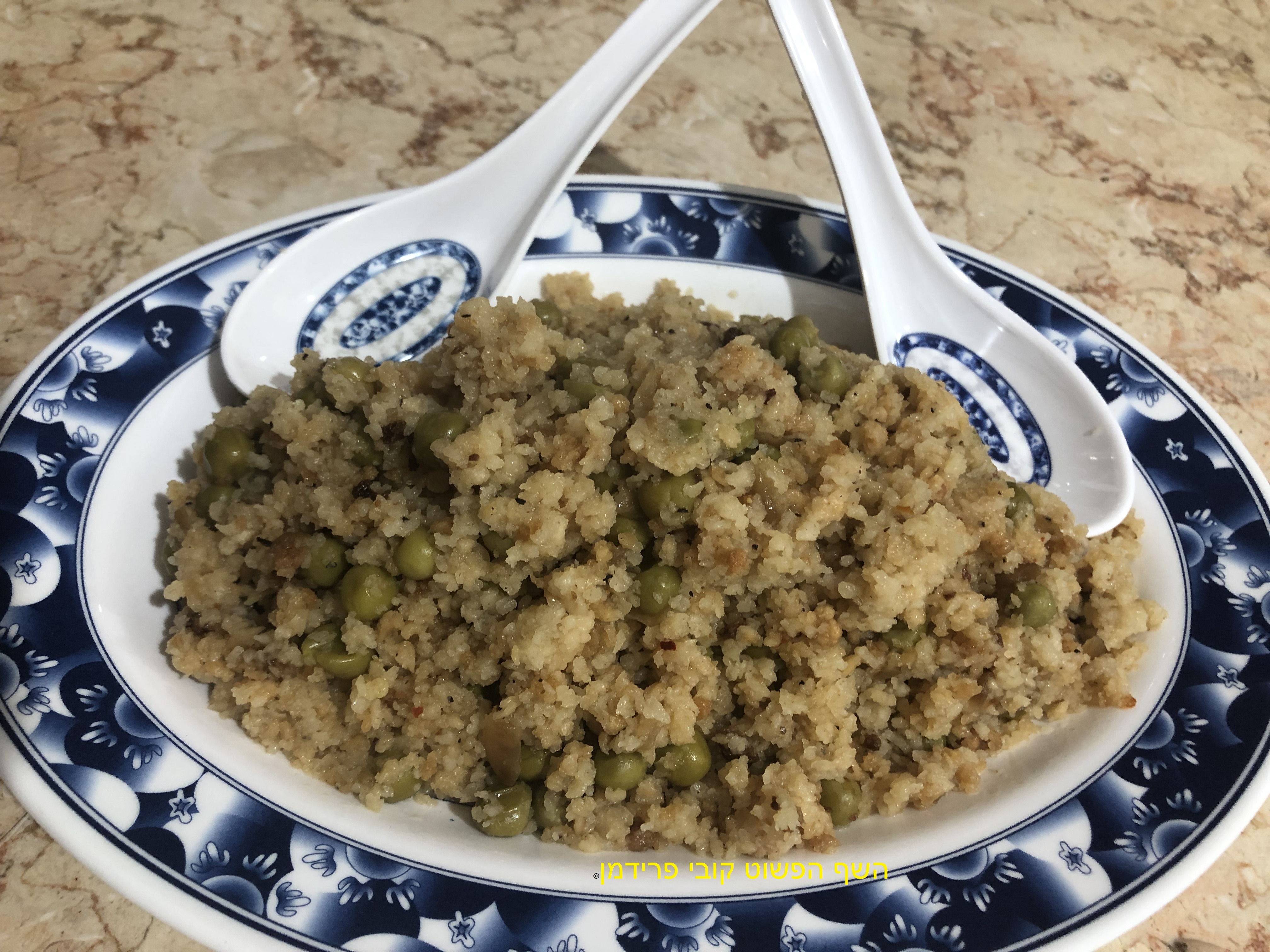 היימישע (ביתי) פערפיל (פתיתים)עם אפונה ובצל מקורמל מבית סבתא,(הקוסקוס של האשכנזים),