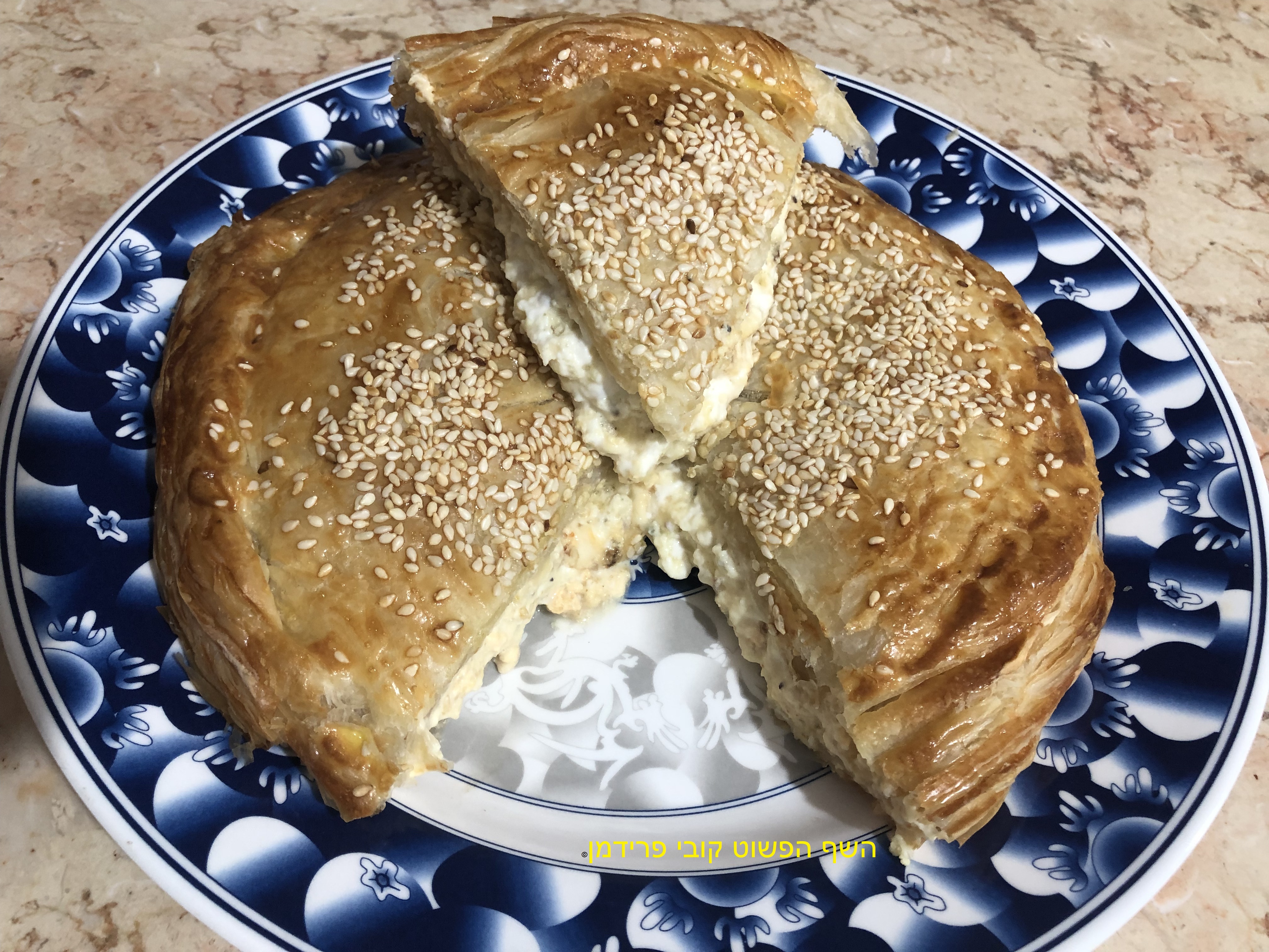 לערבב בקערה 50 ג"ר גבינה צפתית 5% 50 ג"ר גבינה בולגרית 5% 50 ג"ר גבינה צהובה מגורדת מעט פלפל שחור גרוס חצי כפית עלי זעתר יבשים גרוסים ביצה אחת,