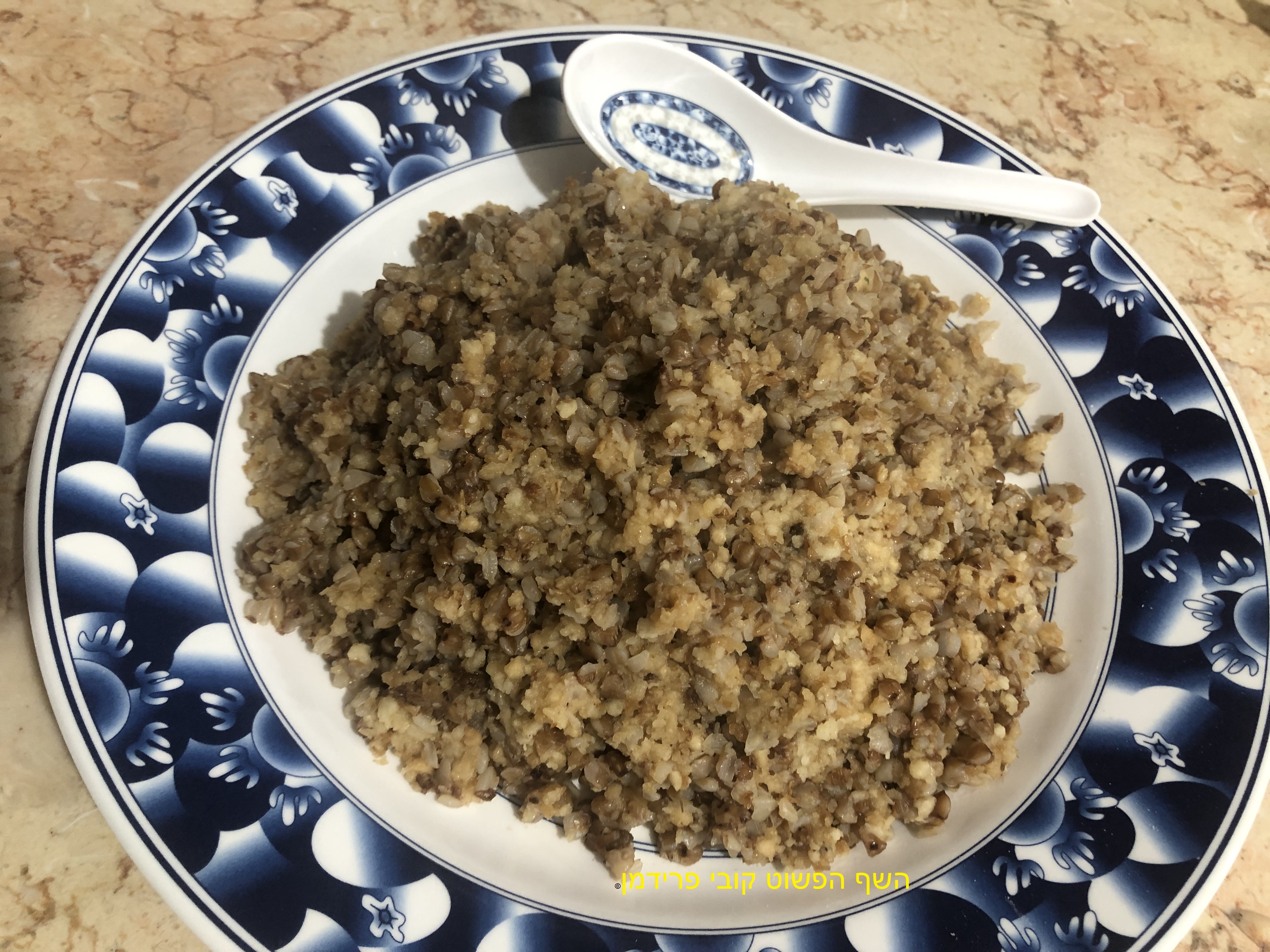 קאשלך מיט פארפיל(כוסמת עם פתיתים)עם בצל מקורמל טבעוני,