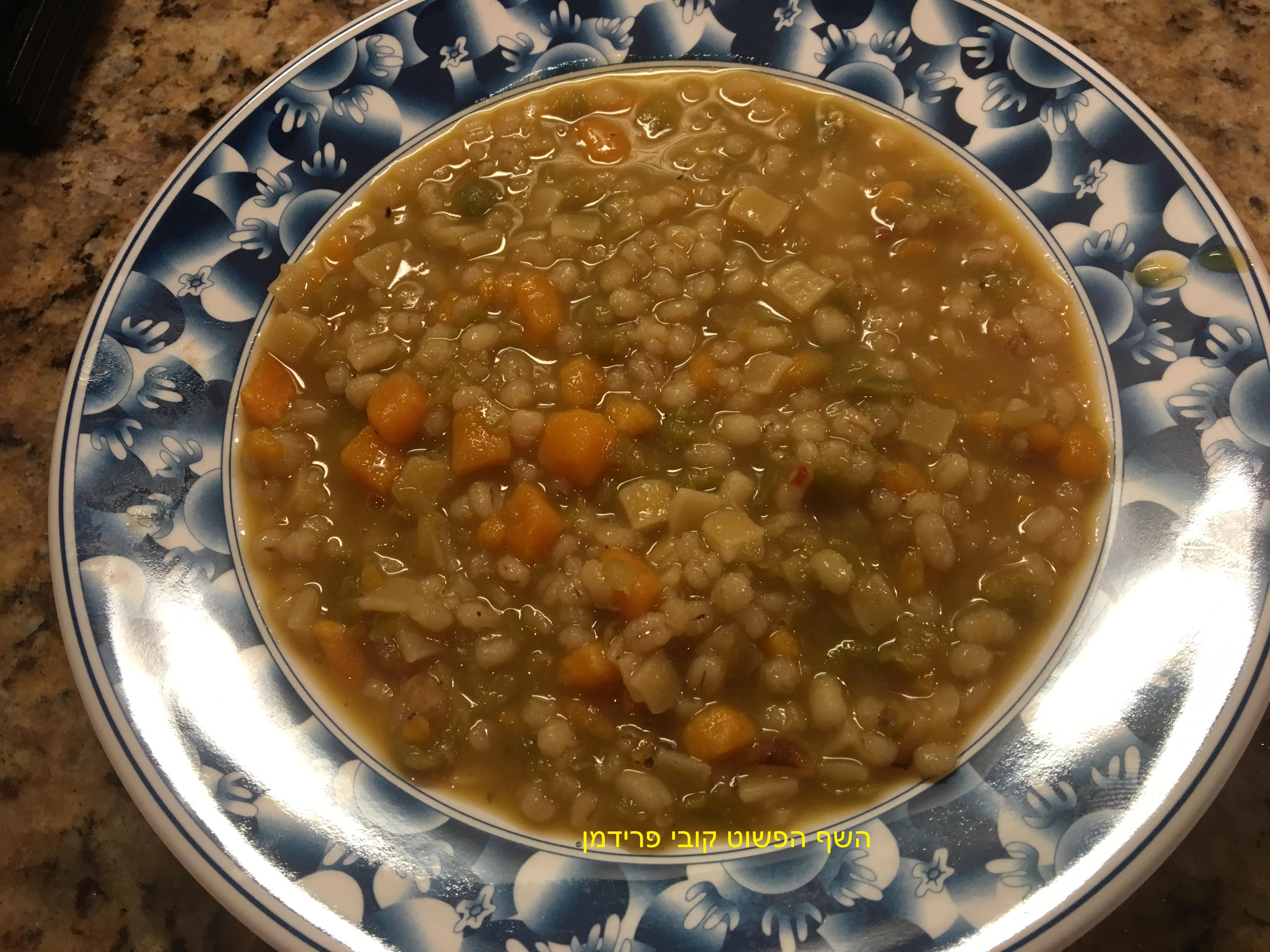 מרק בטטה אפונה גריסי פנינה ואטריות מיני ריבוע,