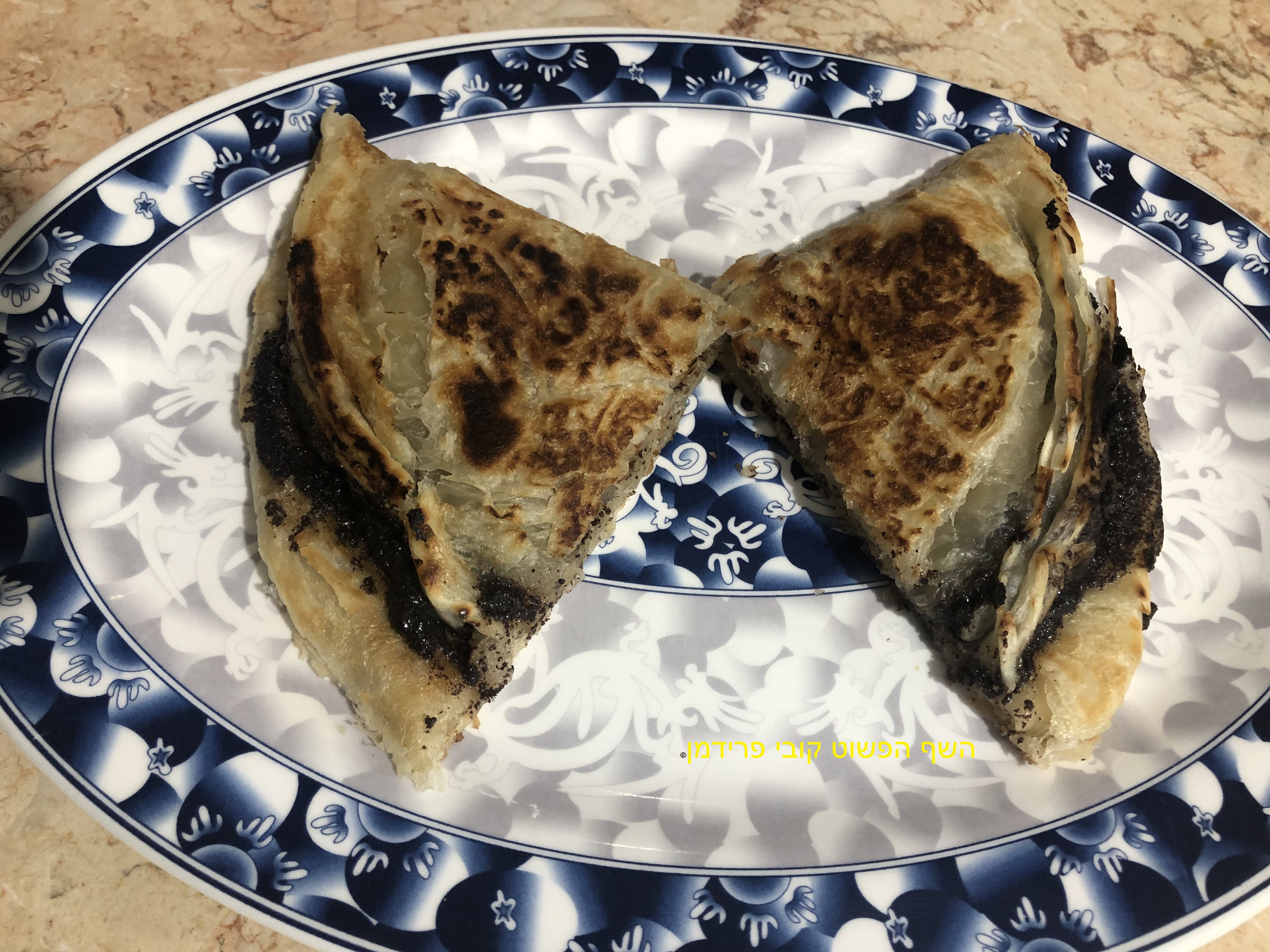 לטגן צד אחד חצי טיגון וצד שני 43 טיגון,להניח על החצי מהמלווח שמטוגן 43 3 כפות פרג (להשאיר 2 ס"מ מסביב ללא פרג)לקפל את החצי הריק על המלא להדק בצדדים,