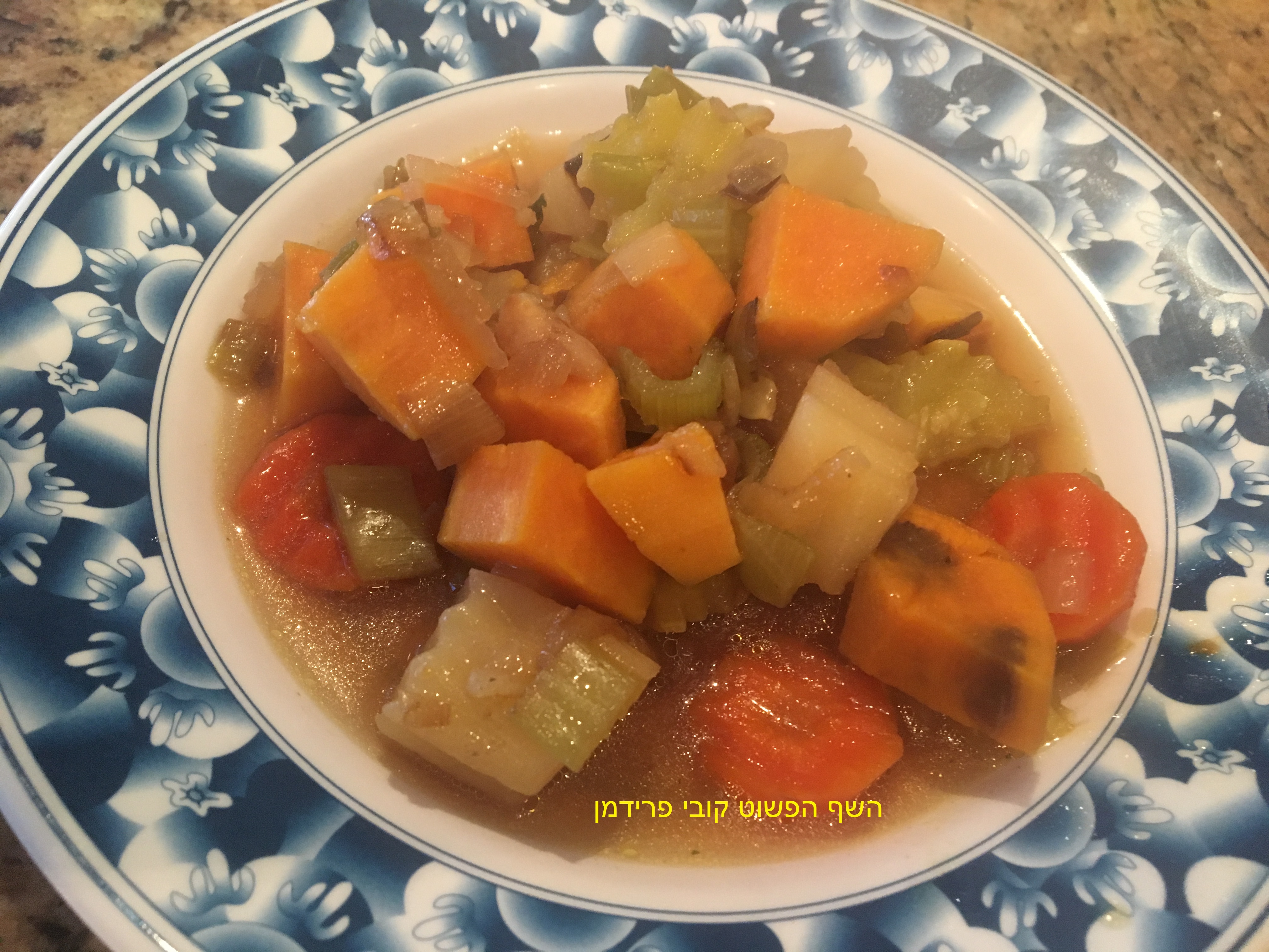 להוסיף 2 בטטות חתוכות לקוביות קטנות 2 קישואים בחצאי טבעות חתוכים בסכין זיזג ו4 גבעולי סלרי חתוכים דקדק ,