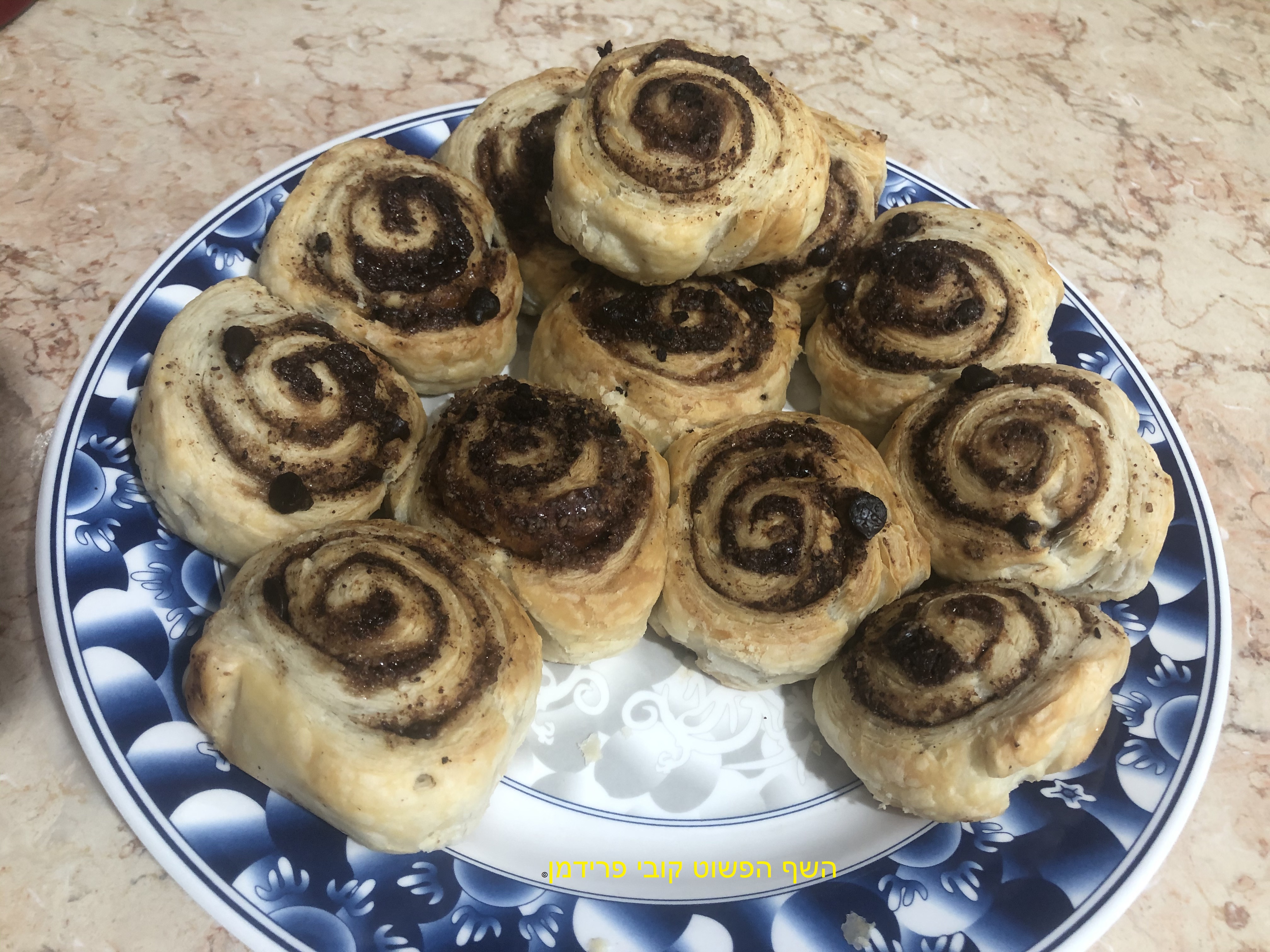 מאפה שושנים עם סוכר דמררה קינמון אבקת חרובים ושוקולד ציפס מריר מבצק עלים,
