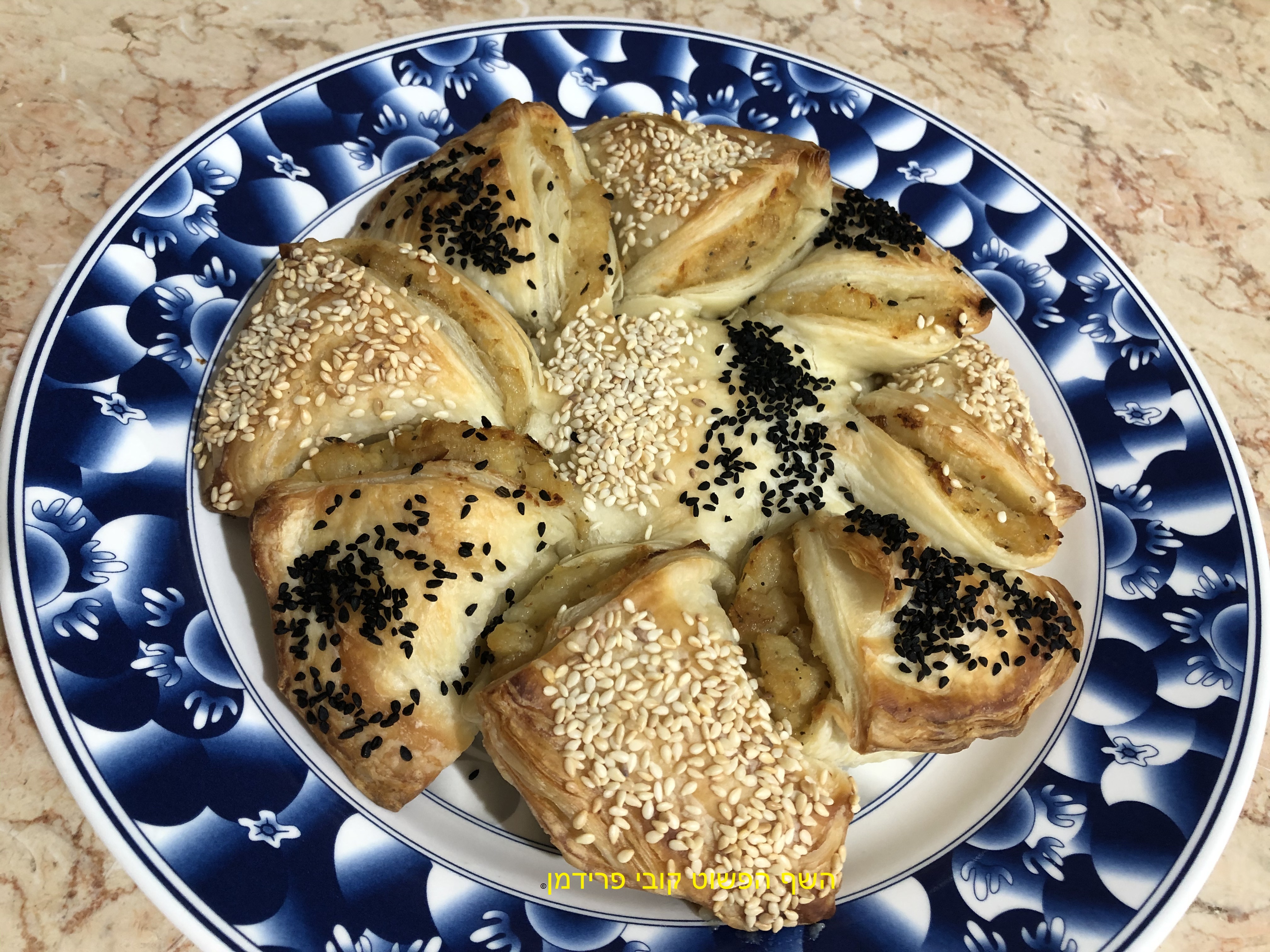 להכין פירה ואו להשתמש מהפירה של אתמול: לבשל ק"ג וחצי תפו"א בקוביות עד רכות לסנן וליבש,למעוך לפירה דקדק,לקרמל 4 בצלים להוסיף חצי כפית עלי תימין יבשים טחונים חצי כפית עלי אוגנו יבשים טחונים חצי כפית פלפל שחור גרוס כפית מלח הימלייה לטגן בבצלים 3 דקות לפתיחת טעמים,להוסיף לפירה לערבב,