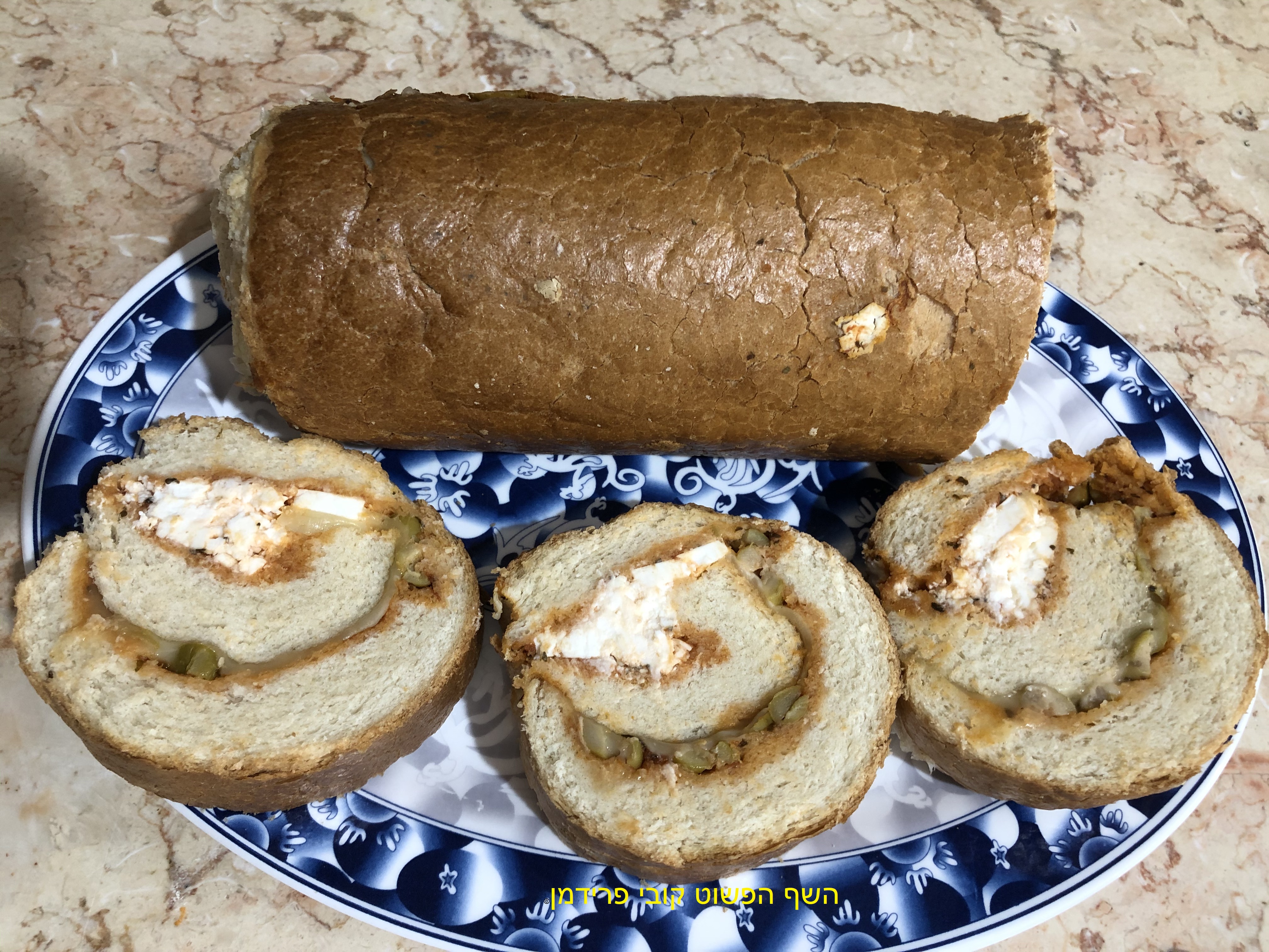 חותכים את הלחם לרוחב לא עד הסוף ופותחים למשטח רחב,