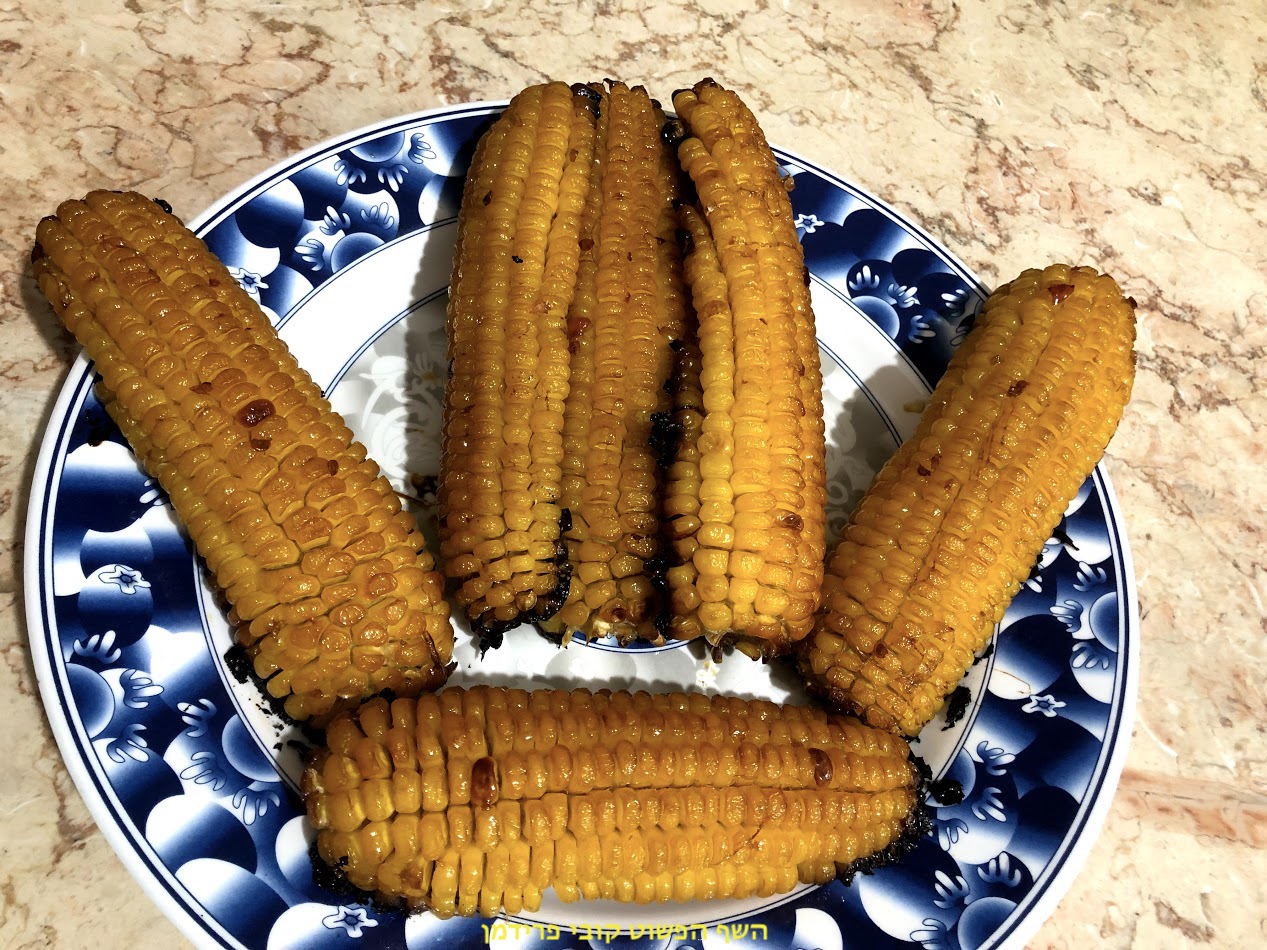 חצאי קלחי תירס בתנור עם צילי מתוק סויה וסילן טבעוני ללא גלוטן,