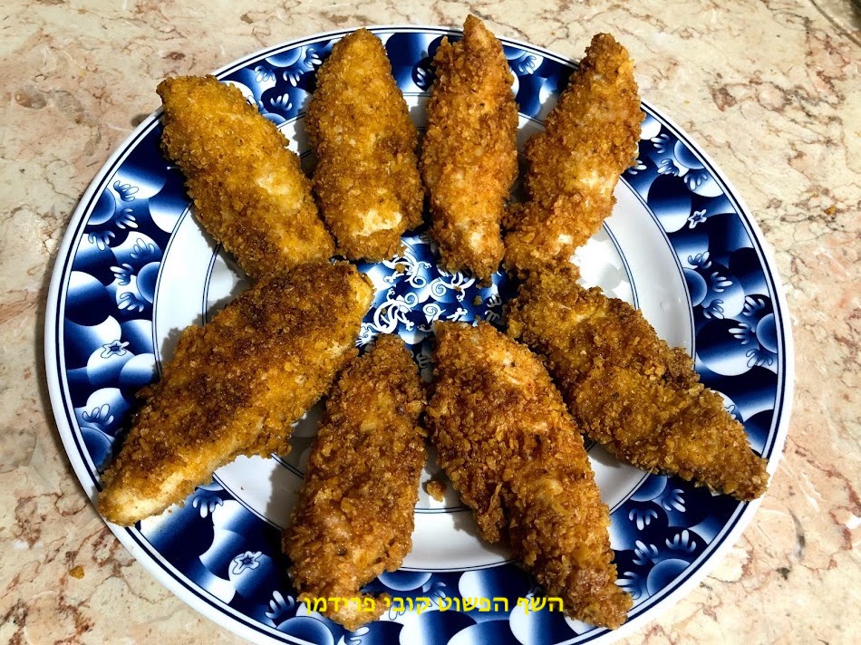 שניצל מפילה עוף בציפוי פירורי דוריטוס בטעמים עם טחינה ללא ביצים וללא גלוטן,