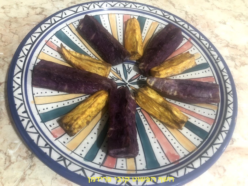 לחתוך 300 ג״ר בטטה סגולה ו300 ג״ר בטטה כתומה לאצבעות של 2 ס״מ באורך 6-8 ס״מ,