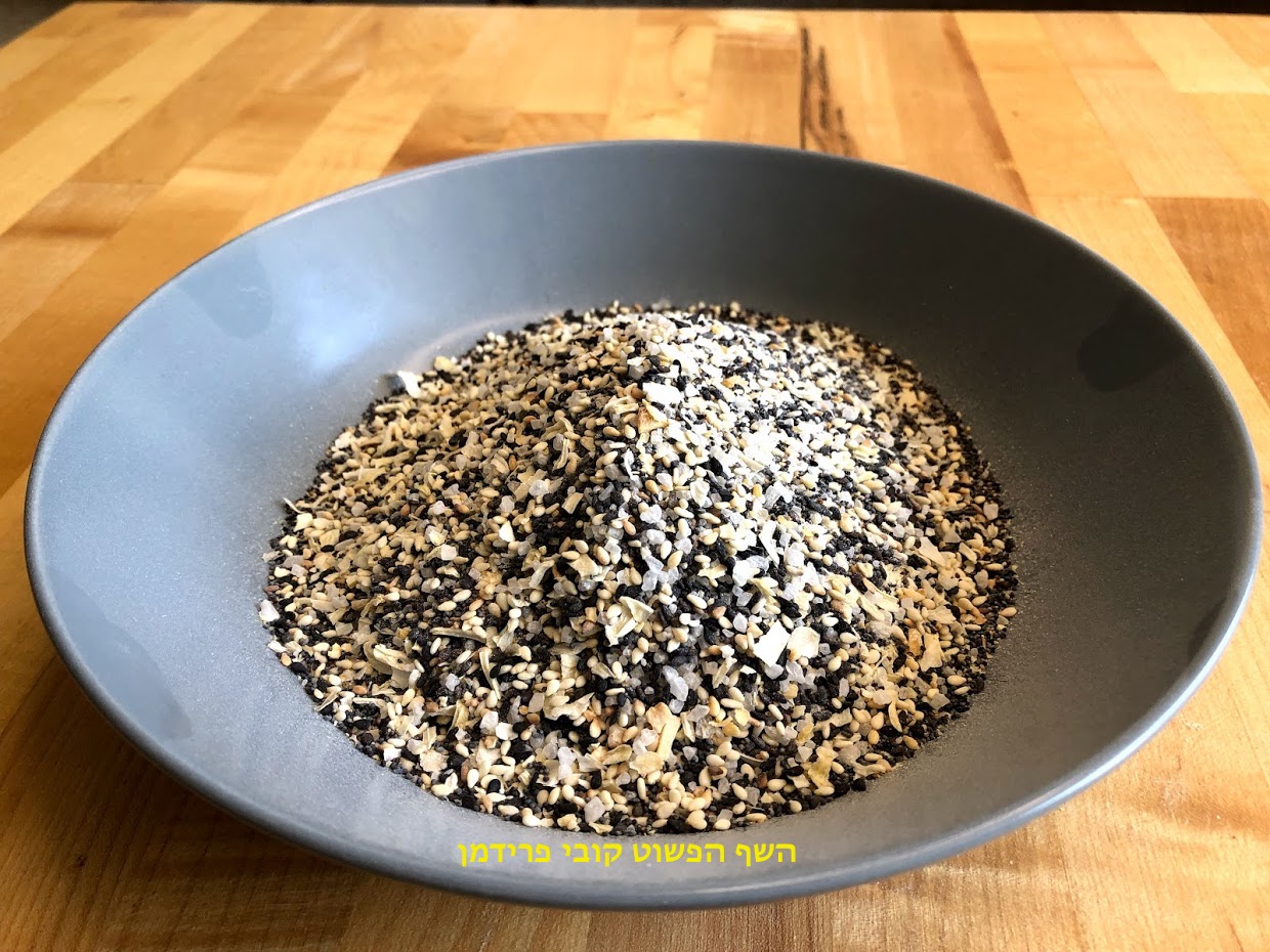 להכניס לקערת ערבוב 4 כפות שומשום קלוי 4 כפות שומשום שחור 4 כפות שבבי בצל(לא מטוגן) 2 כפות שום גבישי 4 כפות פרג שלם 3 כפות מלח גס,