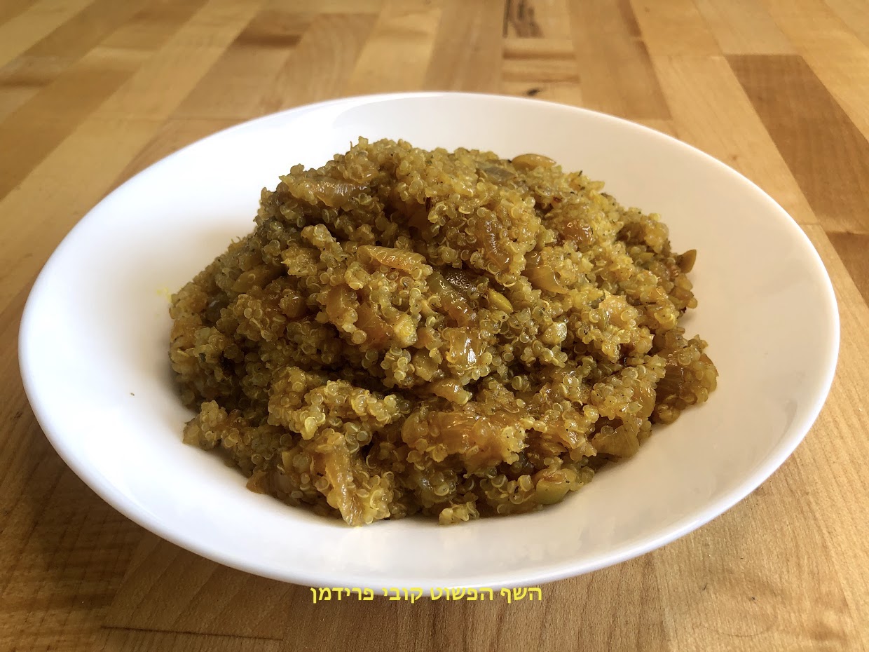 קינואה עם זיתים ובצל מקורמל טבעוני ללא גלוטן,