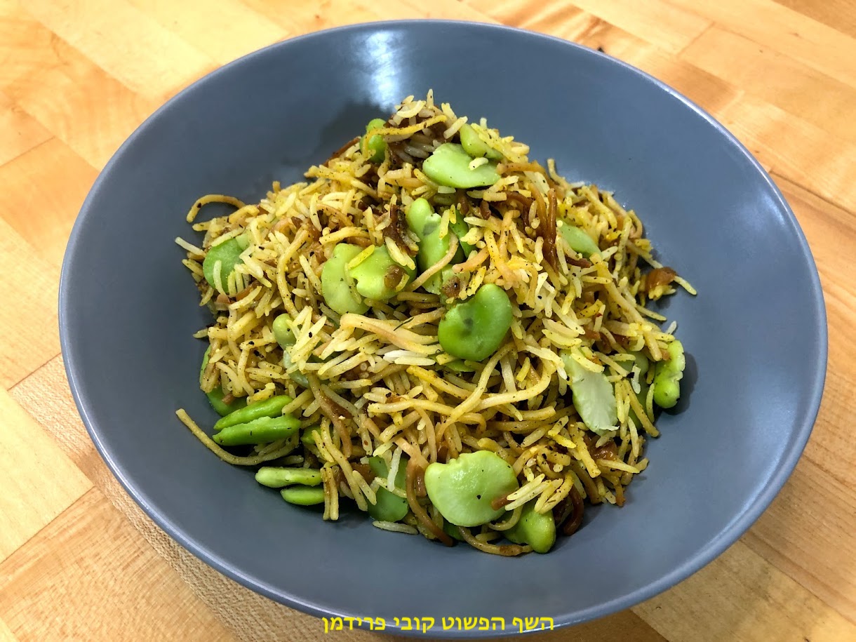 אטריות מטוגנות עם אורז בצל מקורמל ופול ירוק טבעוני,