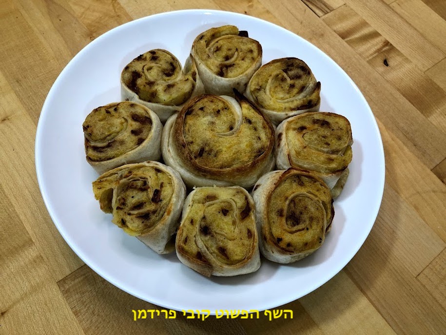 פרח שבלולי טורטיות ממולא פירה תפוא עם בצל מקורמל בתנור טבעוני,