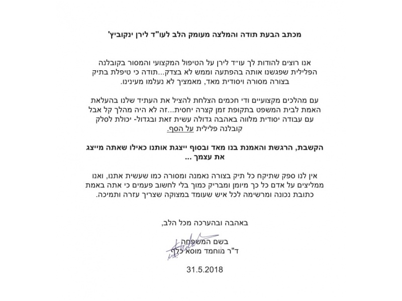 מכתב הבעת תודה והמלצה מעומק הלב לעו"ד לירן ינקוביץ.